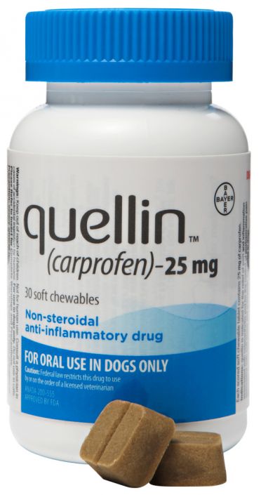 Quellin is the first soft chewable formulation of carprofen (generic form of Rimadyl) which can make giving your pet’s pain medication simple and easy. Each soft chew is scored for effortless dosing and dogs love the meat flavor, so there’s no need to hide the medication inside food or treats. Quellin requires a prescription from your veterinarian.